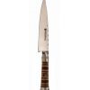 Knife with a steel blade and a braided leather handle. Steel bladed knife: very fine piece of cutlery, handworked stainless german steel “Seigen”, leather braided handle and Alpaca buttons. Height: 4cm – Width: 26,5 cm – Depth: 2,7 cm – Weight: 150 gr.